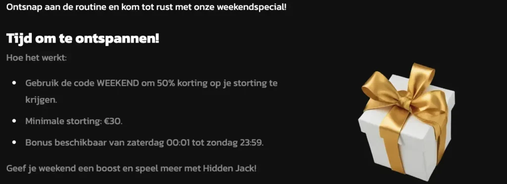 De meest voorkomende aanbiedingen zijn herlaad premies, zoals de Weekendbonus, die je tot €500 extra speelgeld bezorgt. Dit soort promoties zijn enkel te claimen door een Hidden Jack bonus code in te vullen bij het uitvoeren van een storting. De beloningen die je van deze aanbiedingen krijgt, zullen vaak in de vorm van gratis speelgeld of gratis spins zijn. Om de beloning effectief te ontvangen, moet de storting voldoen aan de minimale storting waarde. Indien dit niet het geval is, kan het zijn dat je de beloning niet ontvangt en dat je een nieuwe storting moet uitvoeren om deze toch te kunnen claimen.