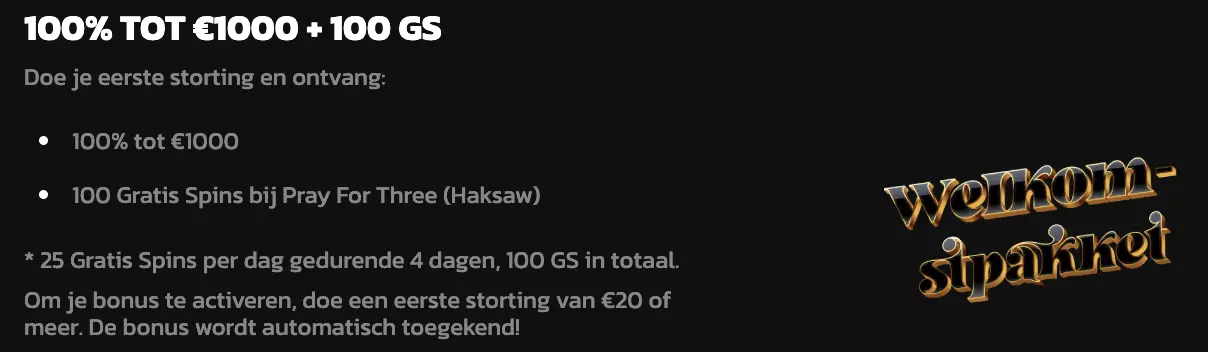 | No.4 | 50% van je storting tot €1000 en 100 GS voor Sweet Bonanza 1000. |