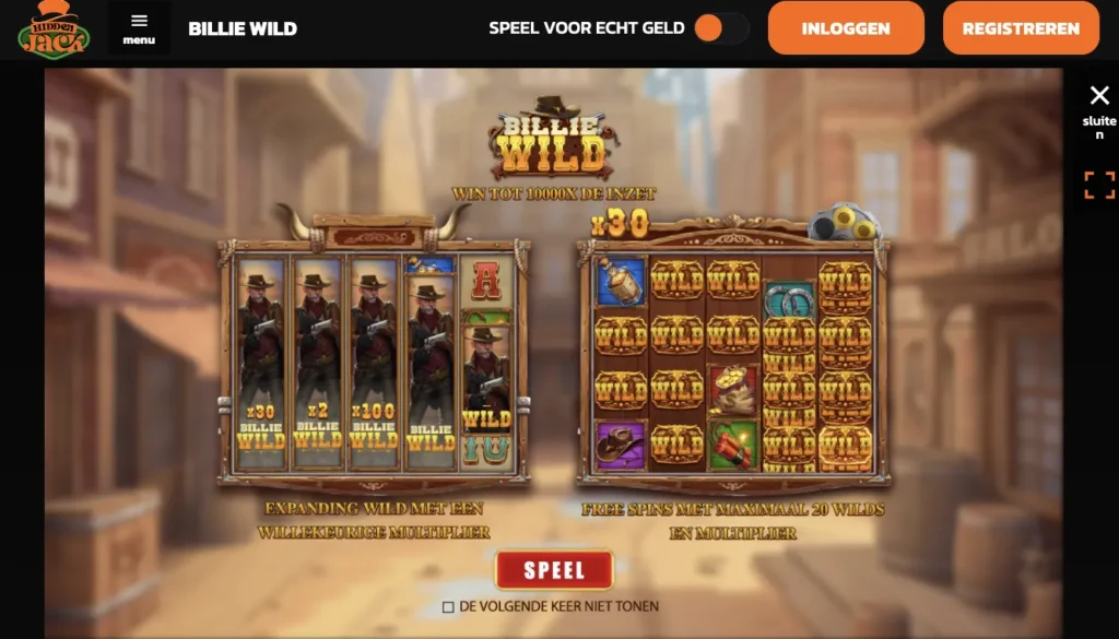 | Billie Wild | Ontgrendel bonus rondes waarbij je gratis spins en multipliers kunt ontvangen. | 10.000x je inzet als maximale winst. |